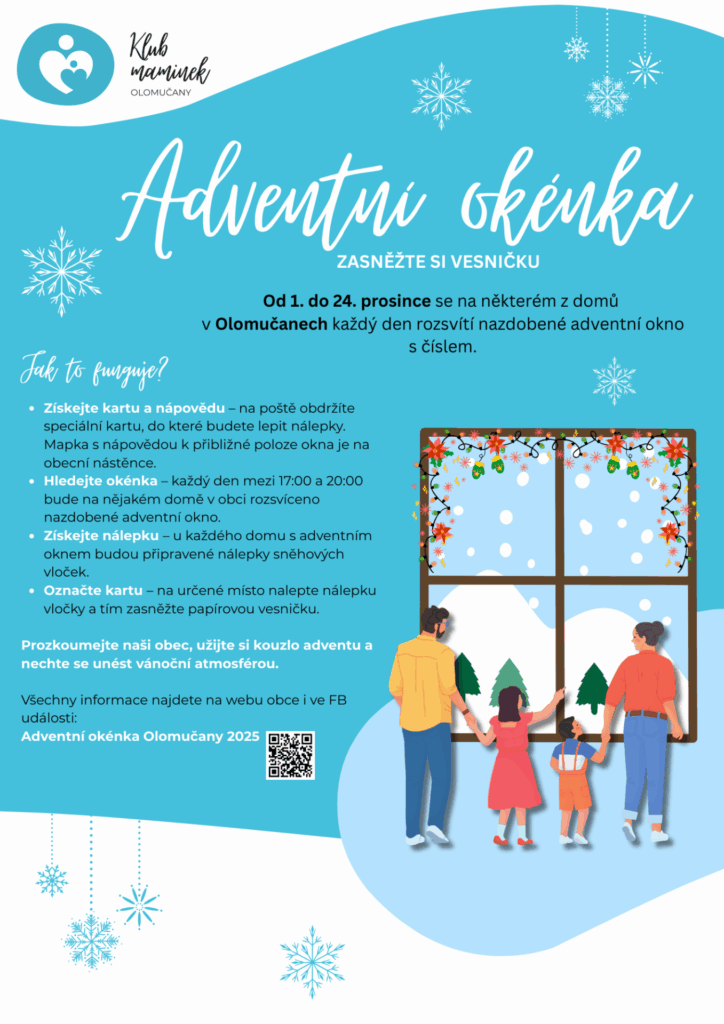 Od 1. do 24. prosince se v Olomučanech každý den rozsvítí jedno krásně nazdobené adventní okno. Přijďte si užít kouzlo adventu a projít se společně naší vesnicí.