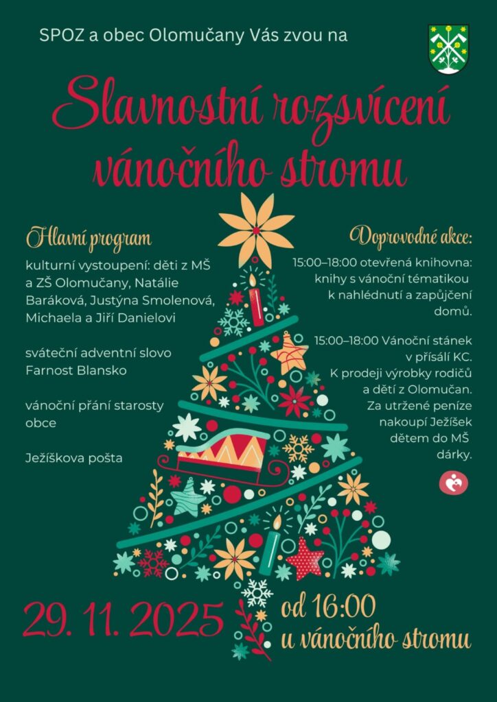 SPOZ a obec Olomučany srdečně zvou dne 29.11.2025 na „Slavnostní rozsvícení vánočního stromu“.