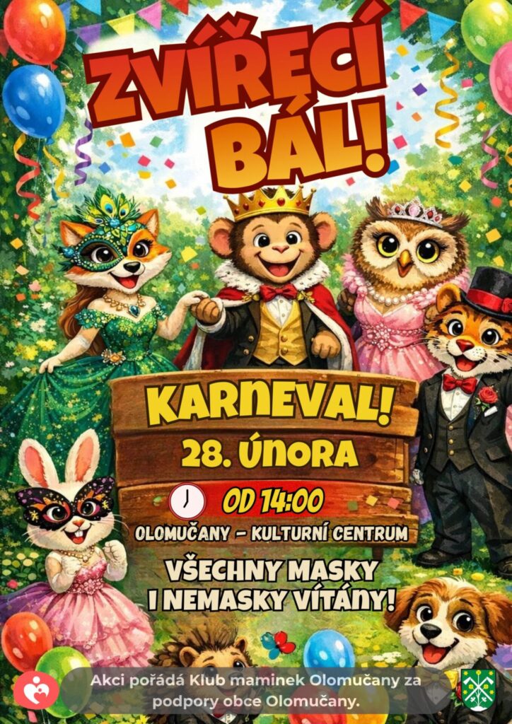 Klub maminek za podpory obce Olomučany zve na veselý karneval, který se koná v sobotu 28. 2. 2026 od 14 do 17 hodin v KC Olomučany. Přijďte si užít odpoledne plné zábavy, masek a sladkých i slaných dobrot.