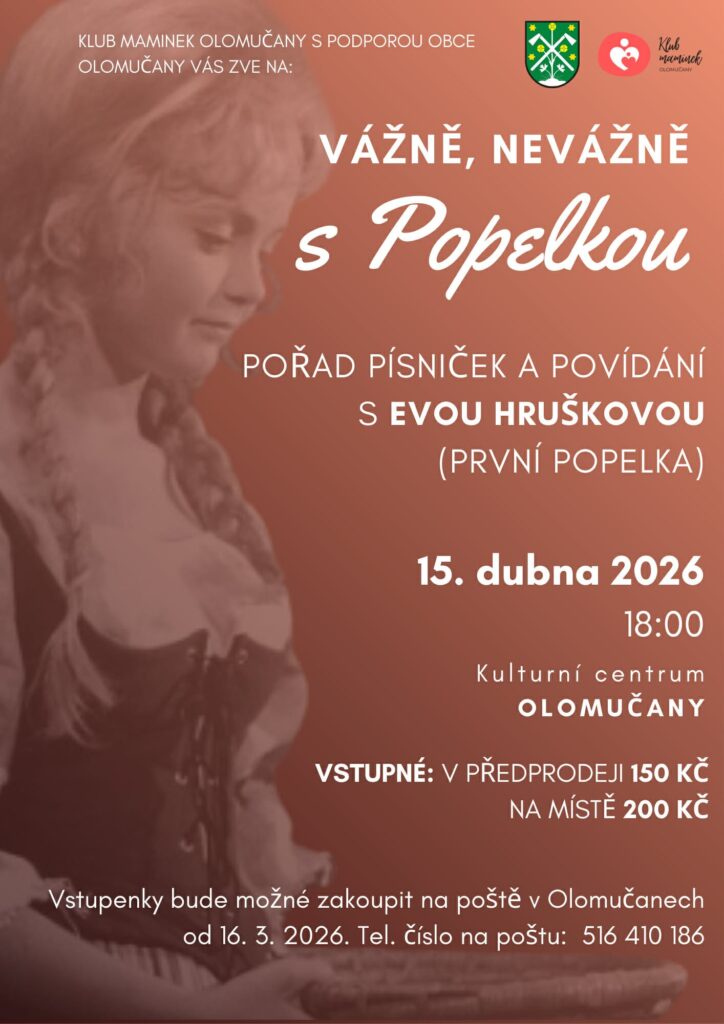 Klub maminek Olomučany s podporou obce Olomučany srdečně zve ve středu 15. dubna v 18:00 na pořad písniček a povídání s Evou Hruškovou (první českou Popelkou). Podrobnosti na plakátu.
